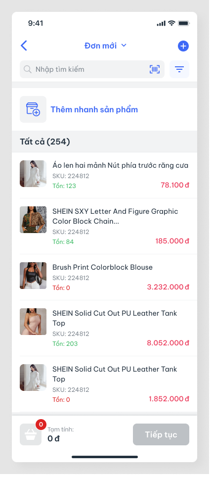 - Tìm kiếm sản phẩm bằng cách nhập tên/mã vạch (barcode) hoặc quét mã vạch trực tiếp bằng camera